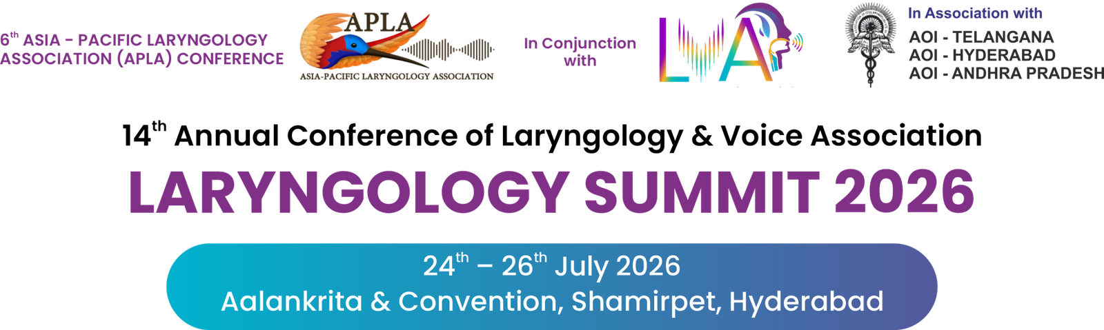 It gives me great pleasure and honor to welcome you all to the 6th APLA CONGRESS Asia – Pacific Laryngology Association in conjunction with 14th Annual Conference of the Laryngology and Voice Association LVA Summit 2026, centered around the theme “Shaping the Future of Airway, Voice & Swallowing: Interdisciplinary Innovations and Inclusivity.”